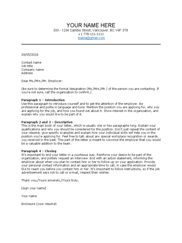 There is a standard cover letter format that most canadian employers will expect you to follow. Below are two sample canadian cover letters (2025) tailored to different scenarios, one for a university internship application and. Your cover letter should highlight your relevant qualifications, experience, and favourable work characteristics. Typically, a cover letter is three. Discover the essential guide to writing.